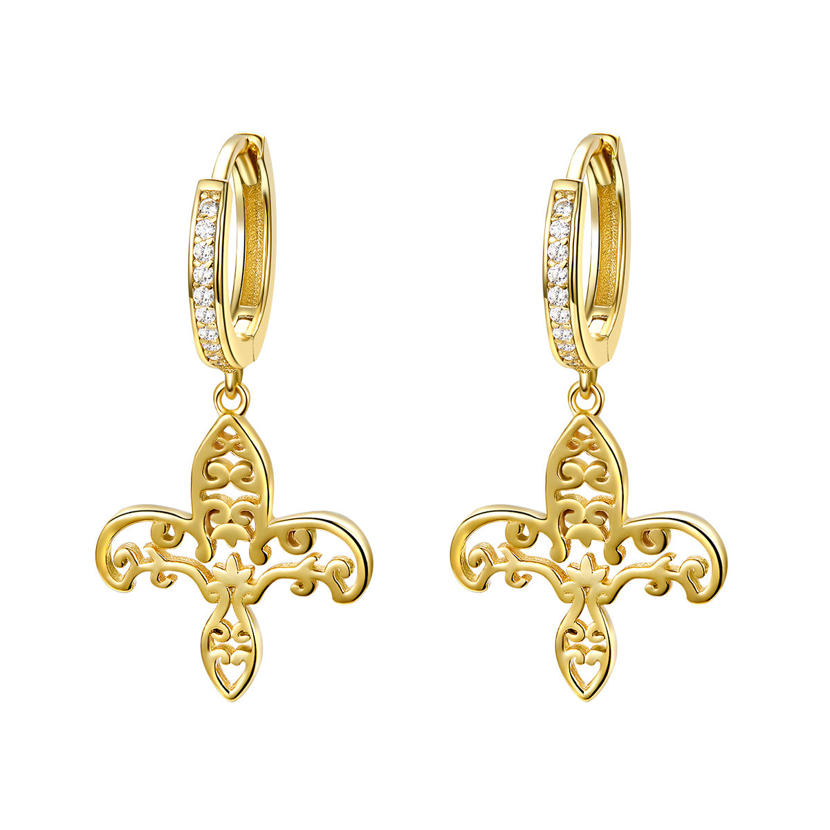 Effortlessly style any outfit with our Gold Iris Dangly Earrings. These elegant earrings feature delicate cubic zirconia hoops and stunning iris flower drops that are plated in gold.