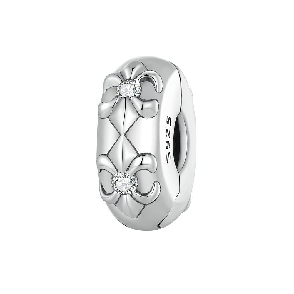 Introducing the Iris Clip Charm, a silver clip adorned with cubic zirconia and an embossed iris design. Elevate your accessories game with this stunning charm.