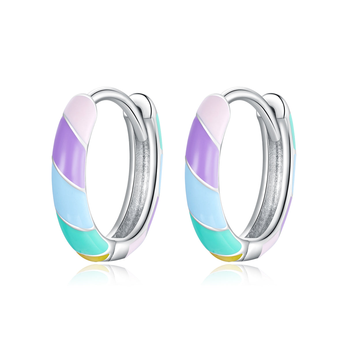 Add a pop of color and show off your playful side with these rainbow striped sterling silver hoop earrings. Add a little fun and cheerfulness to any ensemble.